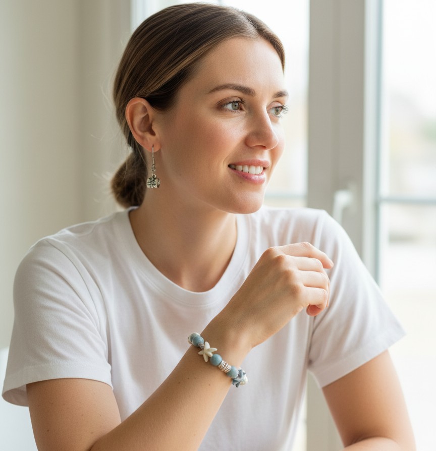 Dive into coastal elegance with this delightful jewelry set, featuring a charming bracelet and matching earrings. The bracelet showcases a playful arrangement of smooth blue and cream-colored beads, interspersed with intricate silver spacers and whimsical starfish charms, evoking the relaxed beauty of the seashore. Complementing the bracelet are delicate silver drop earrings, designed to add a subtle sparkle and complete the oceanic theme.
