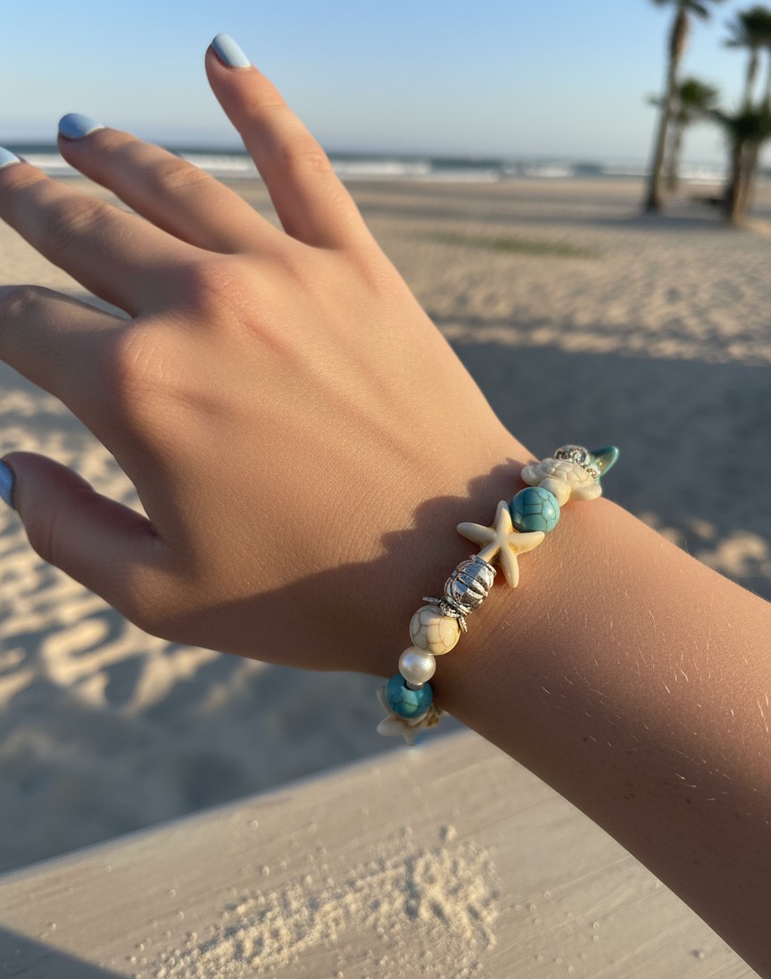 Interspersed throughout are adorable silver-toned charms, including delicate starfish and graceful sea turtles, alongside elegant floral-inspired spacers, adding a whimsical touch of marine life. Crafted with a comfortable stretchy band, this bracelet effortlessly adorns your wrist, providing a perfect fit for any wearer. Whether you’re strolling along the beach or simply dreaming of the sea, this bracelet is a charming statement piece for any coastal enthusiast or as a lovely addition to your summer wardrobe.